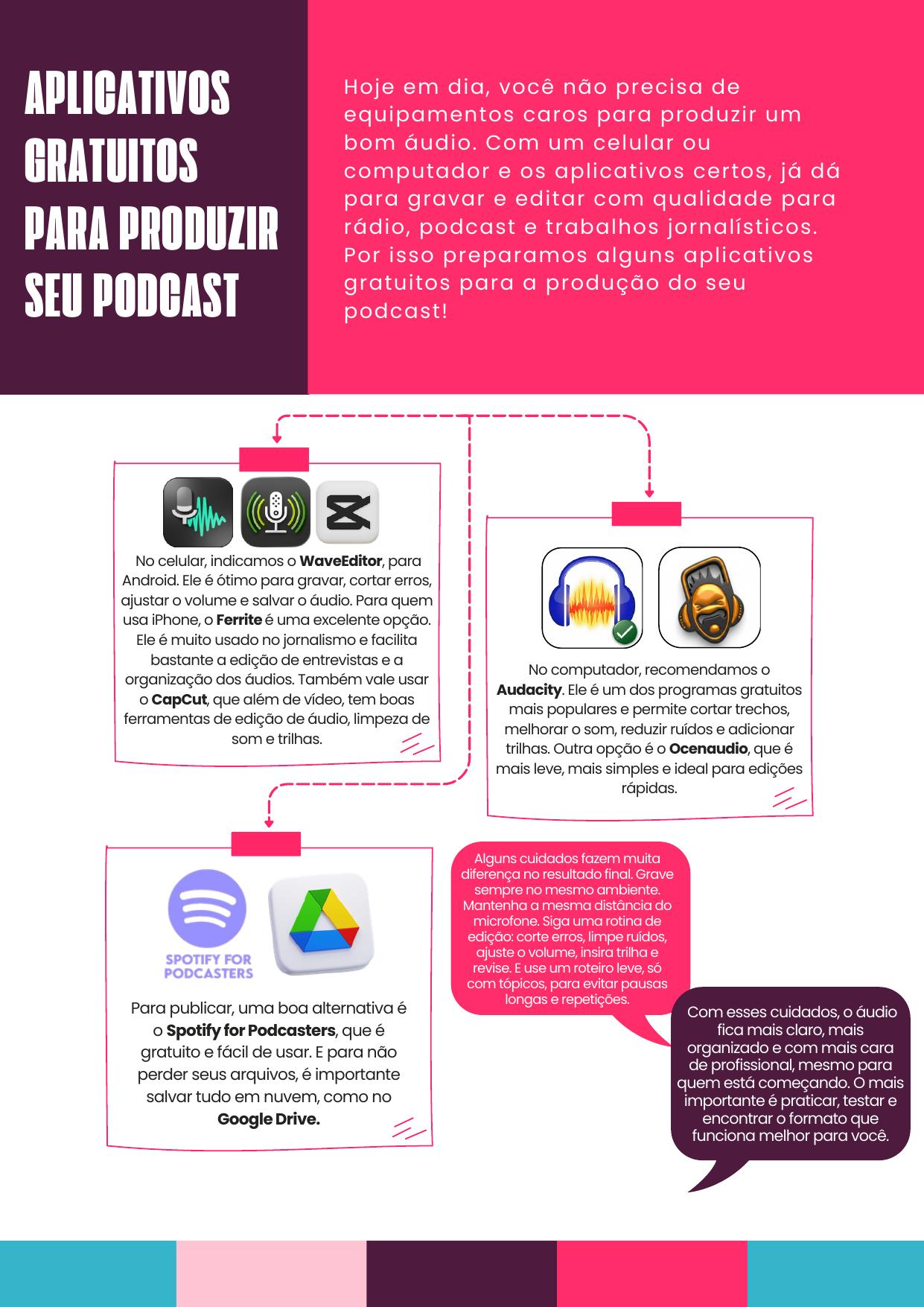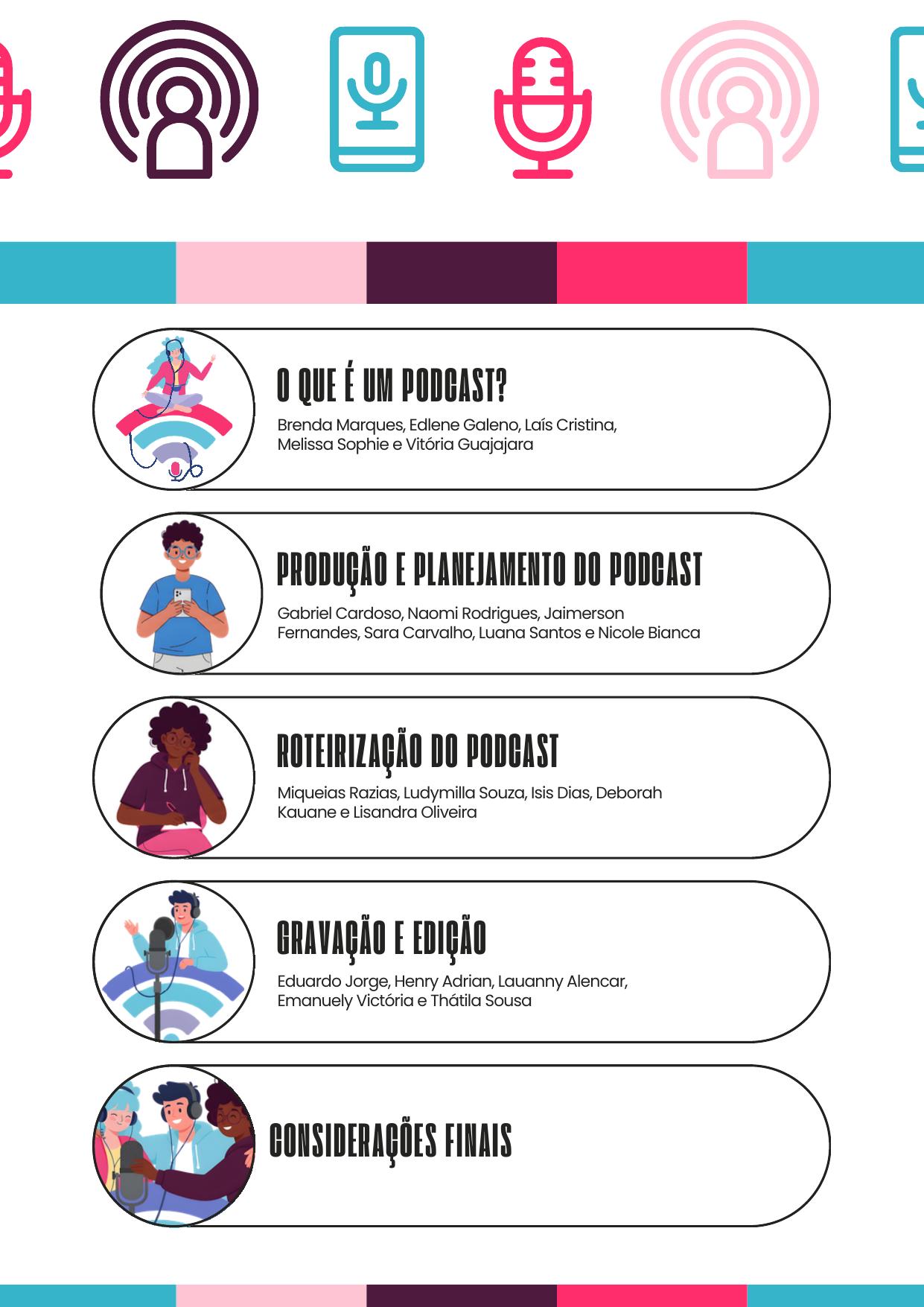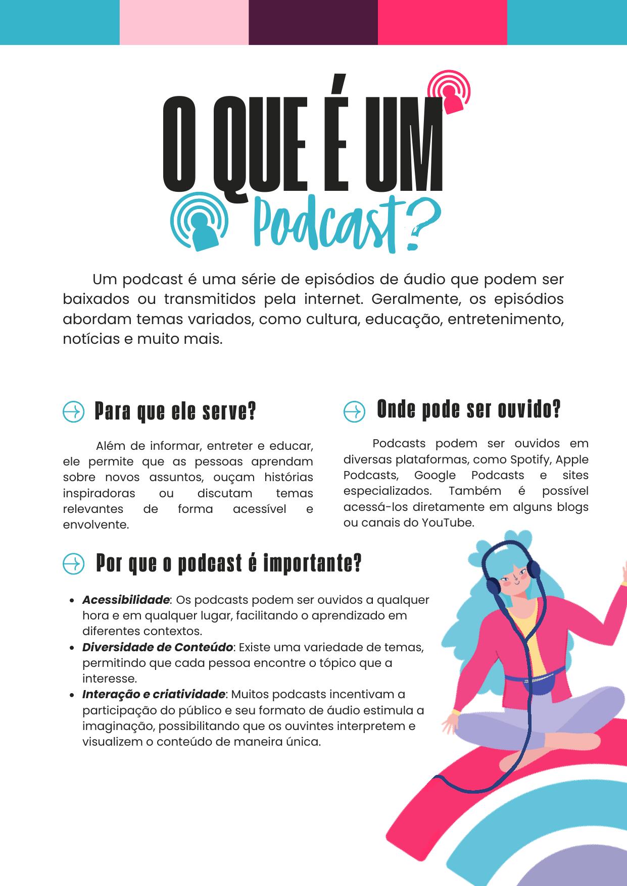 Uma série de episódios de áudio que podem ser baixados ou transmitidos pela internet, abordando temas como cultura, educação, entretenimento e notícias.