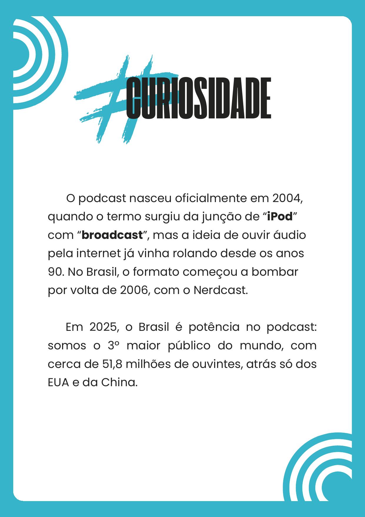 O podcast nasceu em 2004 da junção de iPod + broadcast. Em 2025, o Brasil é o 3º maior público do mundo, com cerca de 51,8 milhões de ouvintes — atrás só dos EUA e da China.